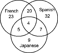 दिए गए वेन आरेख किसी कक्षा में छात्रों की संख्या का प्रतिनिधित्व करते हैं जो तीन भाषाओं, फ्रेंच, स्पेनिश और जापानी का अध्ययन करते हैं।
