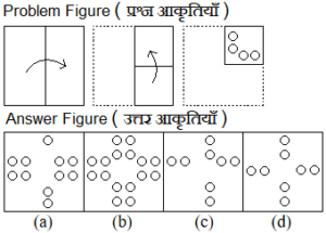 निम्नांकित आकृतियों में एक कागज के टुकड़े को मोड़ने का क्रम और मुड़े हुए कागज को काटने की विधि दर्शाई गई है। यह कागज खोलने पर कैसा दिखेगा?